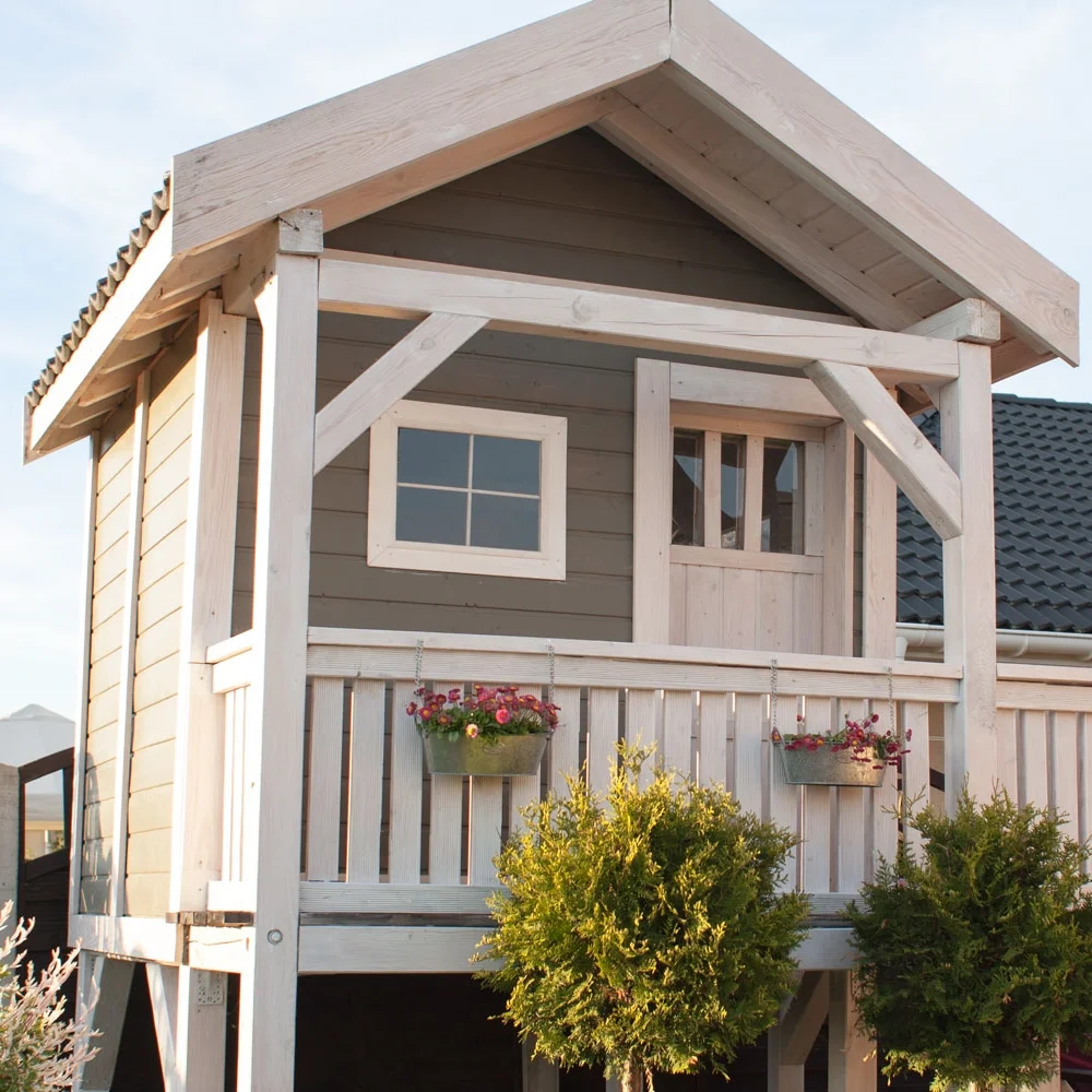 pomalować stelaż domku na biało oraz siding na szaro a podłogę impregnatem w kolorze wenge. (pod warunkiem, że podoba wam się takie zestawienie kolorów).
