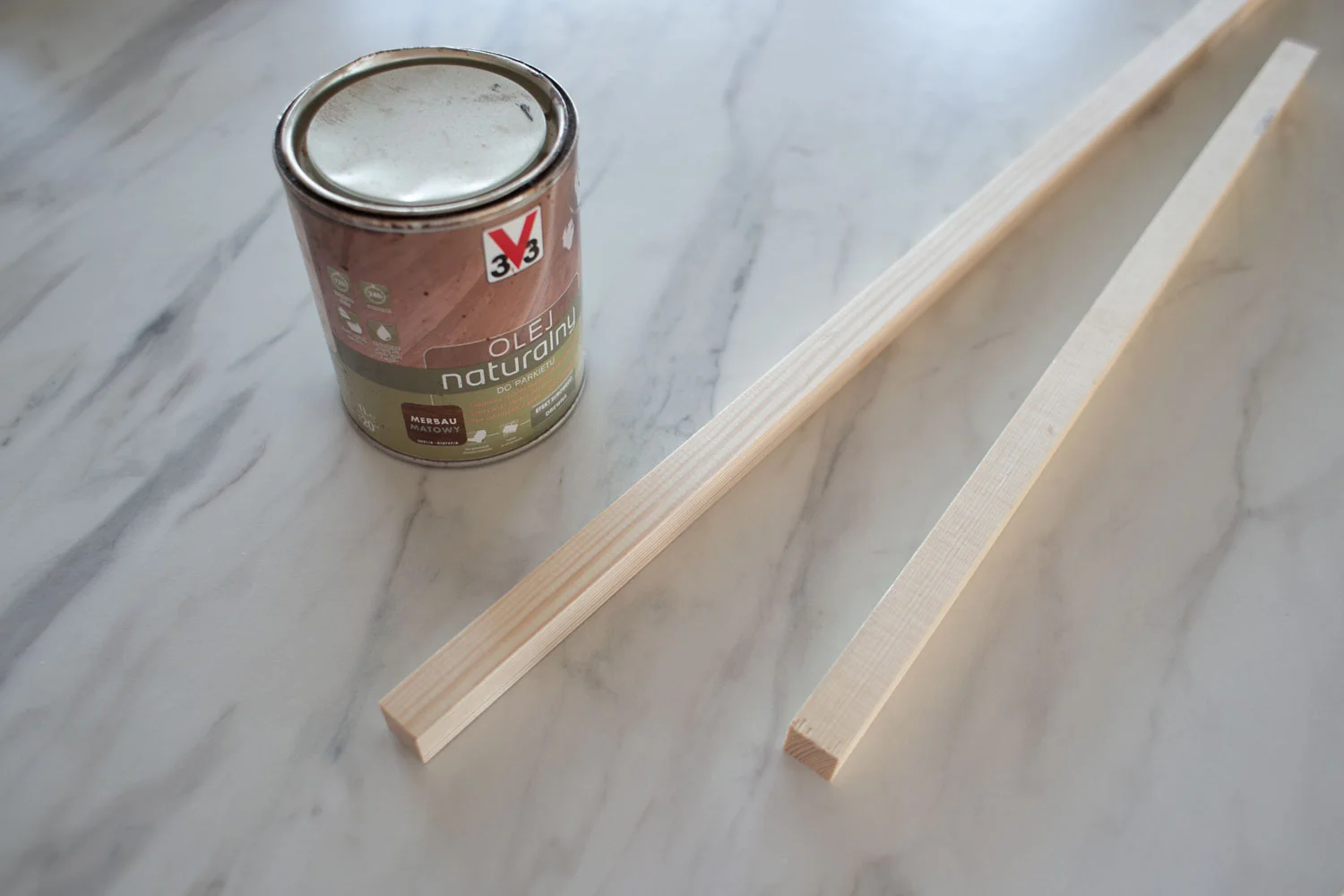 podobnie jak wieszaki, uchwyt jest wykonany z drewnianej listewki (zakupionej w budowlanej sieciówce). tym razem listewka ma 20mmx20mm i też została pomalowana olejem naturalnym V33 w kolorze MERBAU.