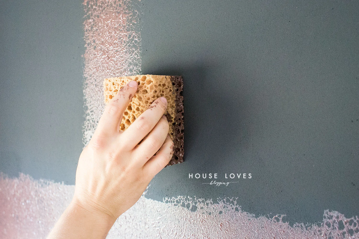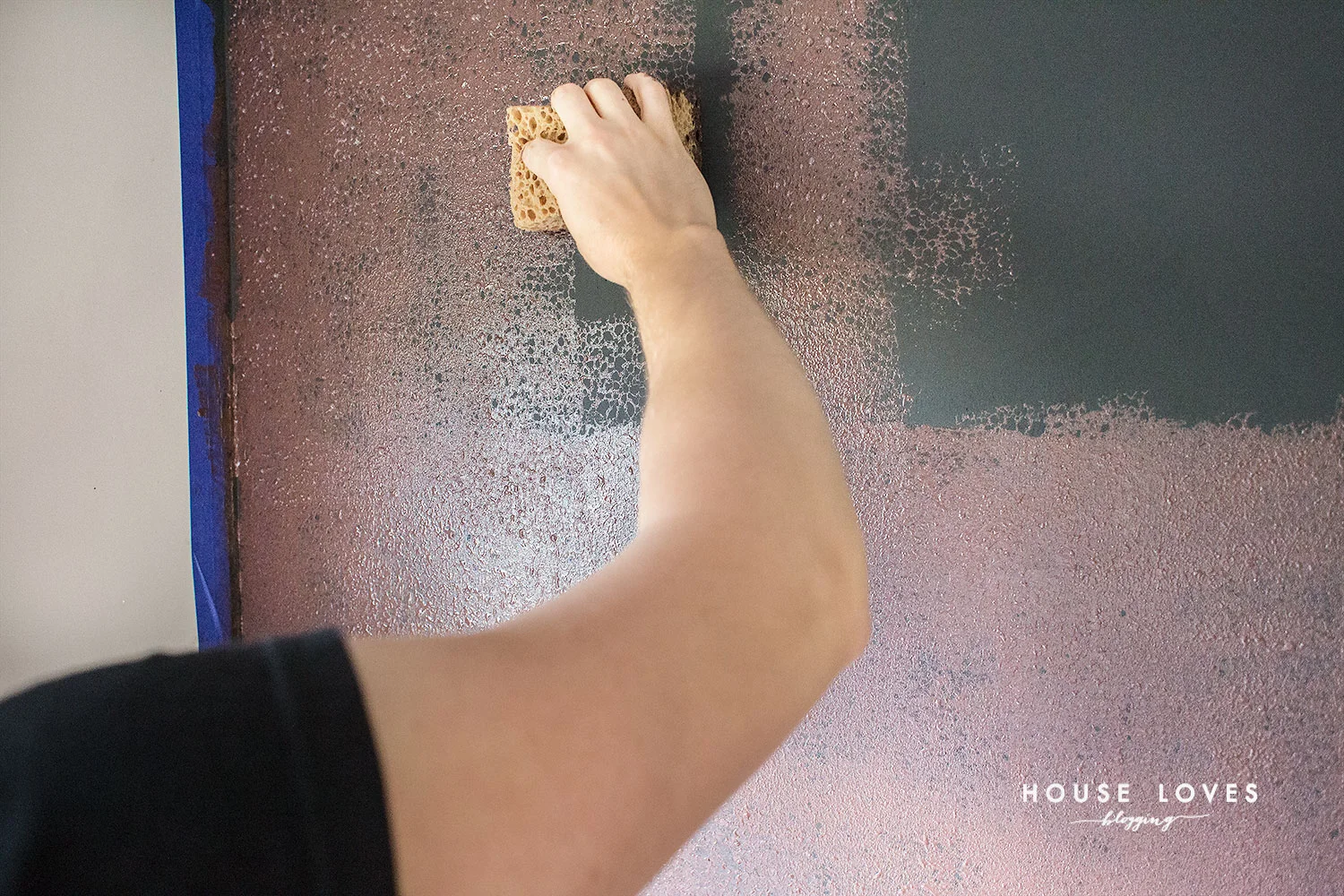 Zanim otworzysz puszkę, dokładnie wymieszaj ją. Potem przelej do kuwety i przy pomocy gąbki o dużych oczkach nakładaj, stemplując ścianę. Nie byłam pewna czy składnik A powinno się nałożyć na całą ścianę, zakrywając czarną farbę gruntującą czy tylko w niektórych miejscach. Ale ostatecznie zrobiliśmy całą ścianę, i tak jest chyba najlepiej, bo wtedy mamy mokrą całość i możemy mieszać ją ze składnikiem B w kolejnym etapie. WAŻNE jest jednak, aby nie nakładać składnika A bardzo grubo, tak, by całkowicie przykrył czarny odcień farby gruntującej. Wręcz odwrotnie powinno być go widać przez składnik B (ten brązowo-bordowy kolor), ponieważ potem daje to ciekawy efekt. U nas jest go chyba nieco za dużo. Jednak, jak zobaczycie, nic się wielkiego nie stało.