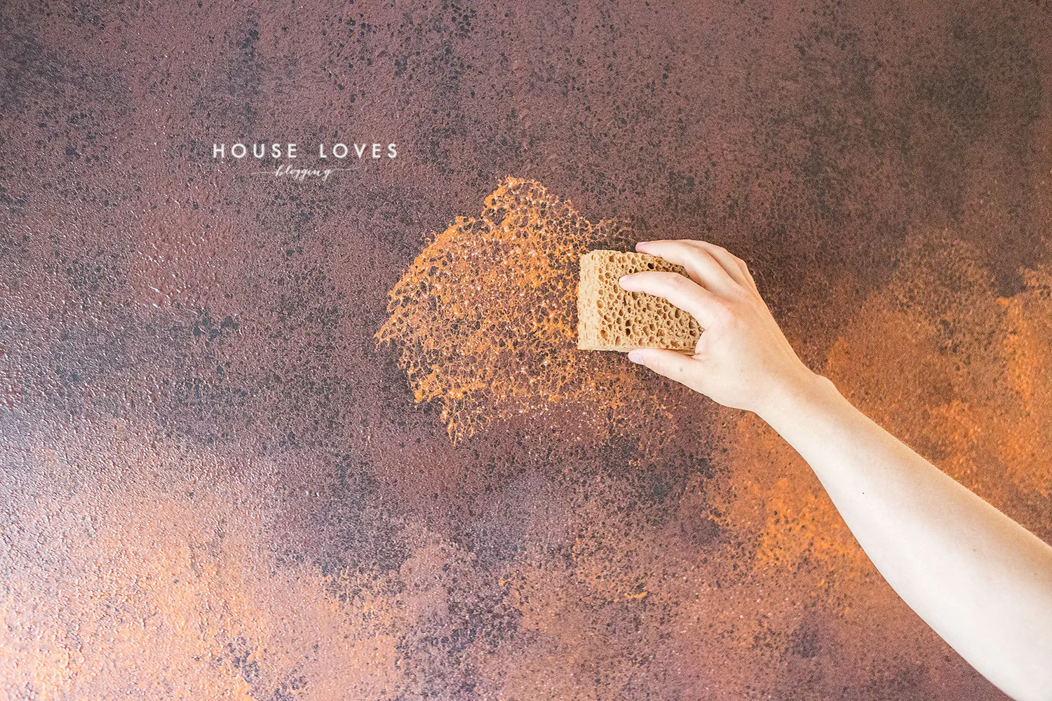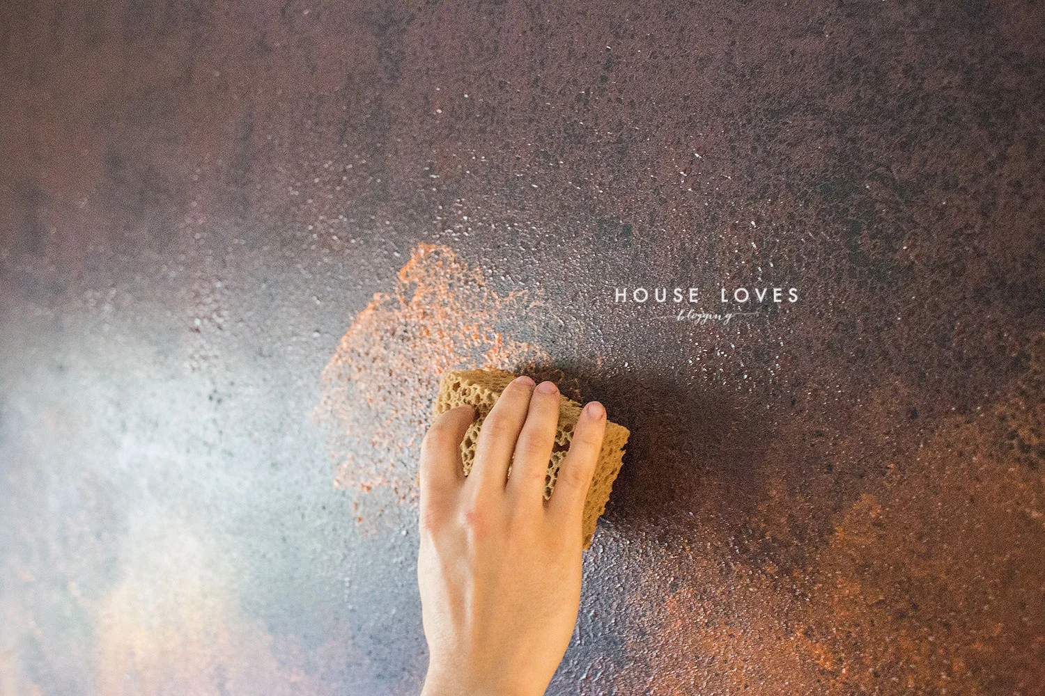 Poczekaj aż ściana wyschnie. Dopiero wtedy zobaczysz efekt rdzy, fakturę farby i przenikanie się kolorów. Jeśli Ci się coś jeszcze nie podoba, chcesz gdzieś zmienić układ wzoru rdzy, to nic straconego, bierz gąbkę w rękę i dołóż składnika A i B to tu, to tam. Możesz w ten sposób dokonać korekty.