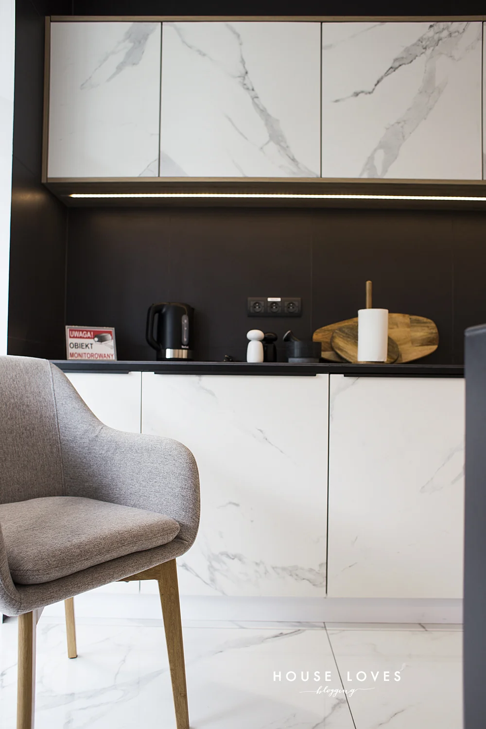 A teraz zobaczcie poniżej tę kuchnię. Czy uwierzylibyście, że fronty szafek kuchennych są wykonane z płytek łazienkowych? Już nie pierwszy raz widziałam takie rozwiązanie, ale chyba pierwszy raz mi się to spodobało. Tutaj też użyte są płytki Pietrasanta, tylko w mniejszym rozmiarze grubości 10mm (60x60cm u góry; czy 80x80 przycięte do 80x60cm na dole - tak mi się wydaje), które przyklejone do laminowanej płyty meblarskiej tworzą odporny na zarysowania, na wodę, uderzenia i wgniecenia - 'wieczny' front. Szczerze powiem, że zastosowałabym coś takiego u siebie. Może któryś z moich klientów się skusi? Teraz mam zdjęcia i będę pokazywać.