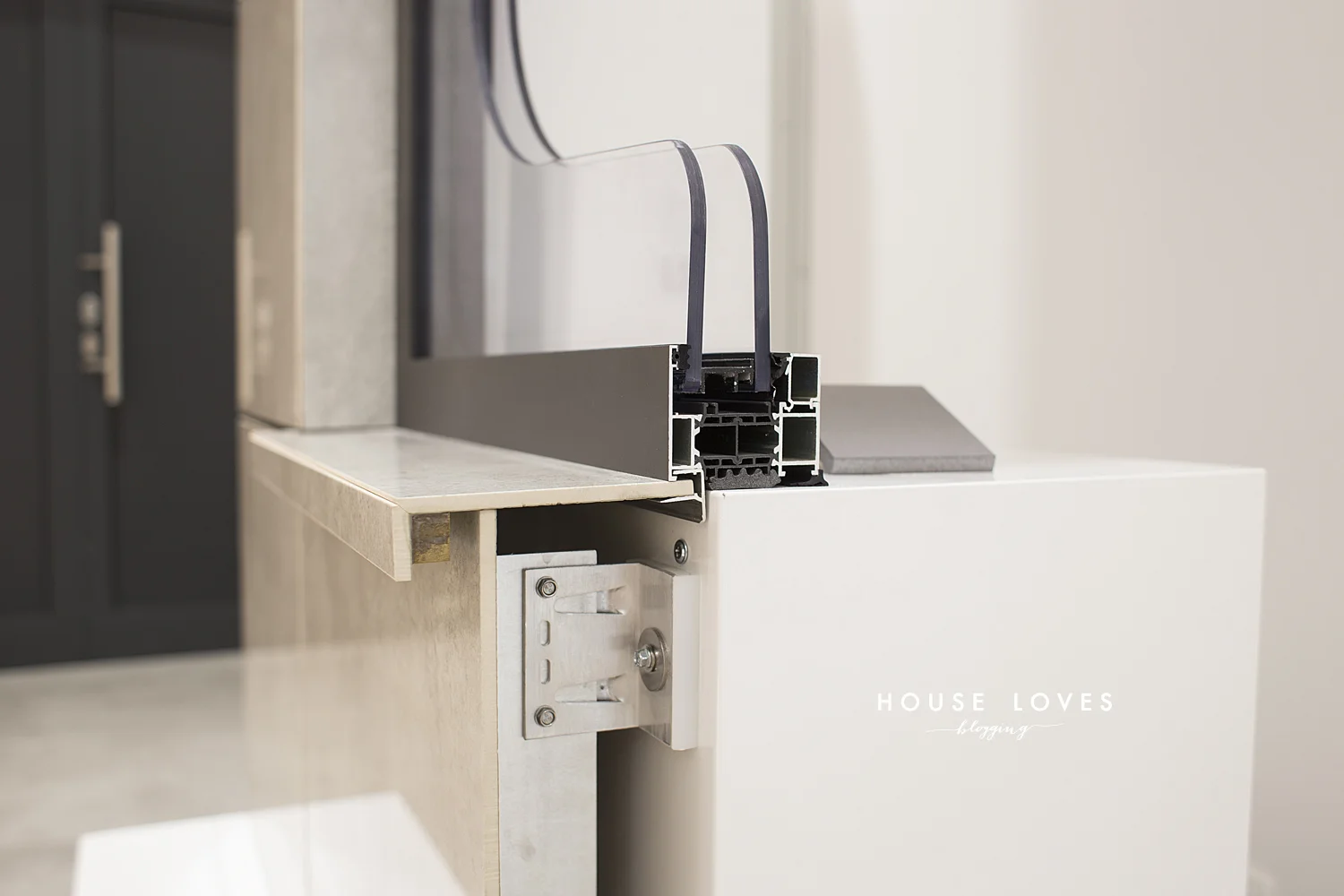 W showroomie można też było podziwiać całą zabudowę garderoby wykonaną od stóp do głów z płytek. Zarówno znowu fronty, jak i blat - wykonane były z płytek z kolekcji Monolith. Tutaj na trzecim zdjęciu od góry możecie zobaczyć jak należy obrabiać blaty, jeśli mają być wyższe niż grubość płytki. Chodzi o zacinanie ich pod kątem 45 stopni i wykonanie ich na stelażu.