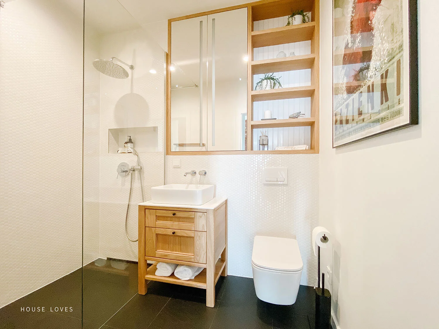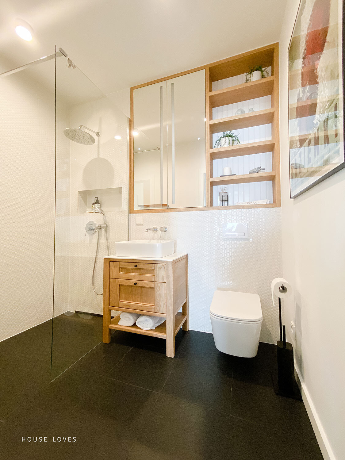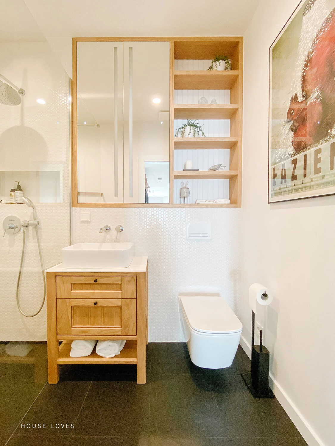 Szafka w łazience jest nie tylko główną ozdobą tego wnętrza, ale posiada dwie pojemne i użytkowe szuflady. Aby jednak wykorzystać całą przestrzeń nad zabudową misy toaletowej i umywalką, zaprojektowaliśmy dodatkową szafkę z lustrem, która w środku posiada kolejne półki do przechowywania kosmetyków. Ta szafka wbudowana jest w otwór ścienny, a pomiędzy jej drewnianymi półkami zamontowane są pionowo pięknie płytki Farrow (link >>>). Wygląda to niesamowicie ciekawie, kiedy do łazienki wchodzi się wprost na dekoracyjne półki.