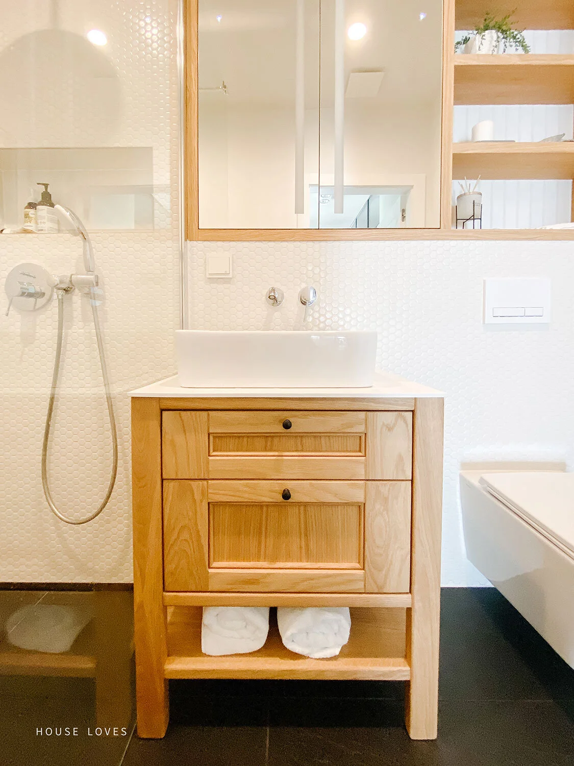Mała łazienka w projekcie DAILY DREAM to połączenie pięknej, białej i delikatnej heksagonalnej mozaiki z kontrastującą i surową (imitującą łupek) podłogą. Obie płytki są wypełnione fugą w kolorze ich samych, aby ujednolicić odbiór tych kolorów, nie skupiając wzroku na wzorze płytek. Taka kombinacja przyciąga i choć jest bardzo klasyczna, nawiązuje do skandynawskich klimatów. Wszystko ocieplają dębowe szafki. Ta pod umywalką jest z litego drewna, wykonana dokładnie wg naszego projektu przez lokalnego stolarza. Ciekawostką może być cienki blat, który jest niczym innym jak płytą dębową pokrytą odporną farbą (lakierem). Blaty łazienkowe to częsty dylemat, ponieważ każdy chce posiadać blat zupełnie odporny na wodę, jak gdyby ta woda miała się lać po nich jak po ścianie w prysznicu. Ja jednak, z ogromnym sukcesem od 5 lat, użytkuję swój lakierowany blat z mdf w toalecie (link do bloga opisującego moją toaletę tutaj >>> ) i widzę, że posiadanie kamiennego blatu przy umywalkach nablatowych nie jest koniecznością. Jeśli budżet na to nie pozwala, można pomyśleć o innym materiale, jak blat lakierowany czy laminowany (taki też jest w łazience rodzinnej projektu DAILY DREAM >>> link ).