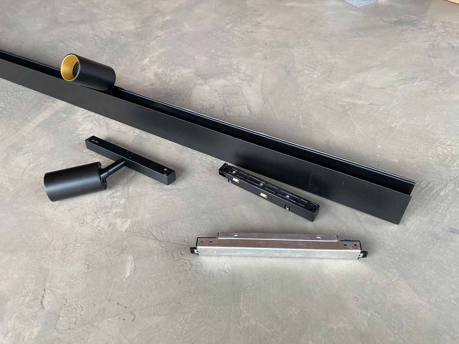 Jak wspomniałam, głównym elementem ARCHLINES są profile. Od tego zaczynacie budować układ oświetlenia. W zależności od typu Waszego sufitu (sufit podwieszany lub sufit betonowy) wybieracie albo profil wpuszczany w sufit, albo natynkowy. My wybraliśmy ten natynkowy, czyli w całości widoczny, który przykręcamy bezpośrednio do sufitu. W naszym przypadku nawet mamy łatwiej, bo kręcimy lampy bezpośrednio do desek sufitowych, więc nie mamy konieczności walki z wierceniem, kołkami i kurzem z tym związanym. Profile natynkowe występują w dwóch opcjach: wysokiej oraz niskiej, a do tego możemy jeszcze wybrać kolor czarny lub biały.