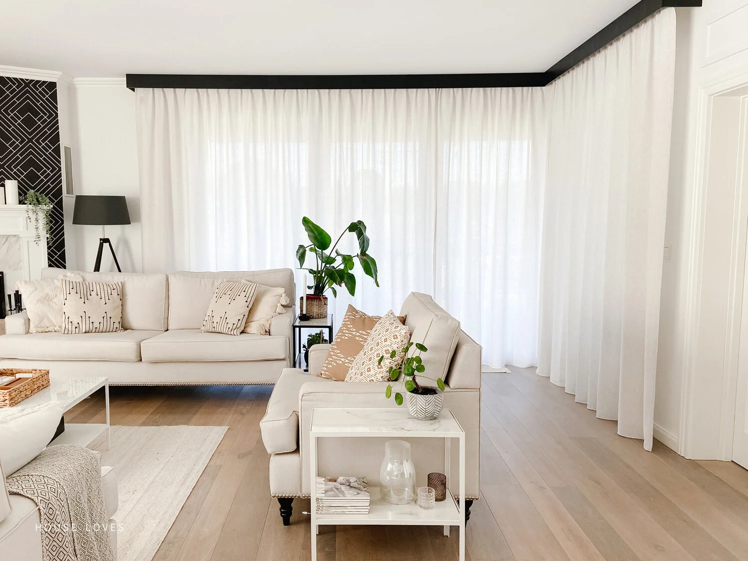 W dziennej przestrzeni naszego domu (#domHL) są dość duże okna: jedno przy jadalni o szerokości 3,5m, drugie w salonie, które jest narożne i ma 3,5m + 1,7m. Już jakiś czas temu zdecydowaliśmy osłonić karnisze czarną maskownicą, która zakrywa sufitowy karnisz. Wykonaliśmy ją sami ze sklejki, którą pomalowaliśmy na czarno. Okna wpuszczają bardzo dużo światła do domu, a ja kocham je ciągle osłaniać i odsłaniać, zarówno firany jak i zasłony. Są więc często przesuwane. Posiadam kilka zestawów zasłon, aby zmieniać klimat wnętrza. Te, które widzicie dzisiaj na zdjęciach, to zestaw nr 3, który pojawił się u nas wraz z nowymi karniszami elektrycznymi. Zakochałam się w tkaninie WISDOM 12 dostępnej ze standardowego katalogu tkanin MIO DECOR. Zobaczcie zdjęcia tkaniny z bliska, gdzie widać melanżowe przejścia kolorów, dzięki czemu materiał wygląda i pięknie, i bardzo naturalnie.