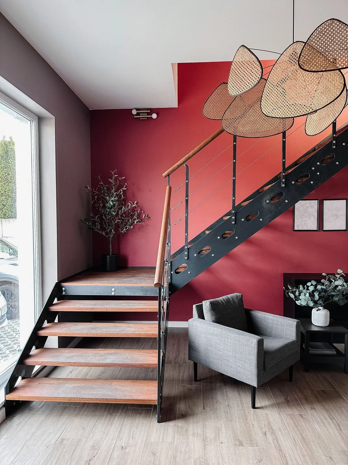Przestrzeń dopełniają schody. Czarna metalowa podstawa przyciąga wzrok i idealnie komponuje się ciężkim i industrialnym stylem z całym budynkiem. Na stopnicach zastosowaliśmy dębowe trepy, które mają przyciemniony kolor dębu.