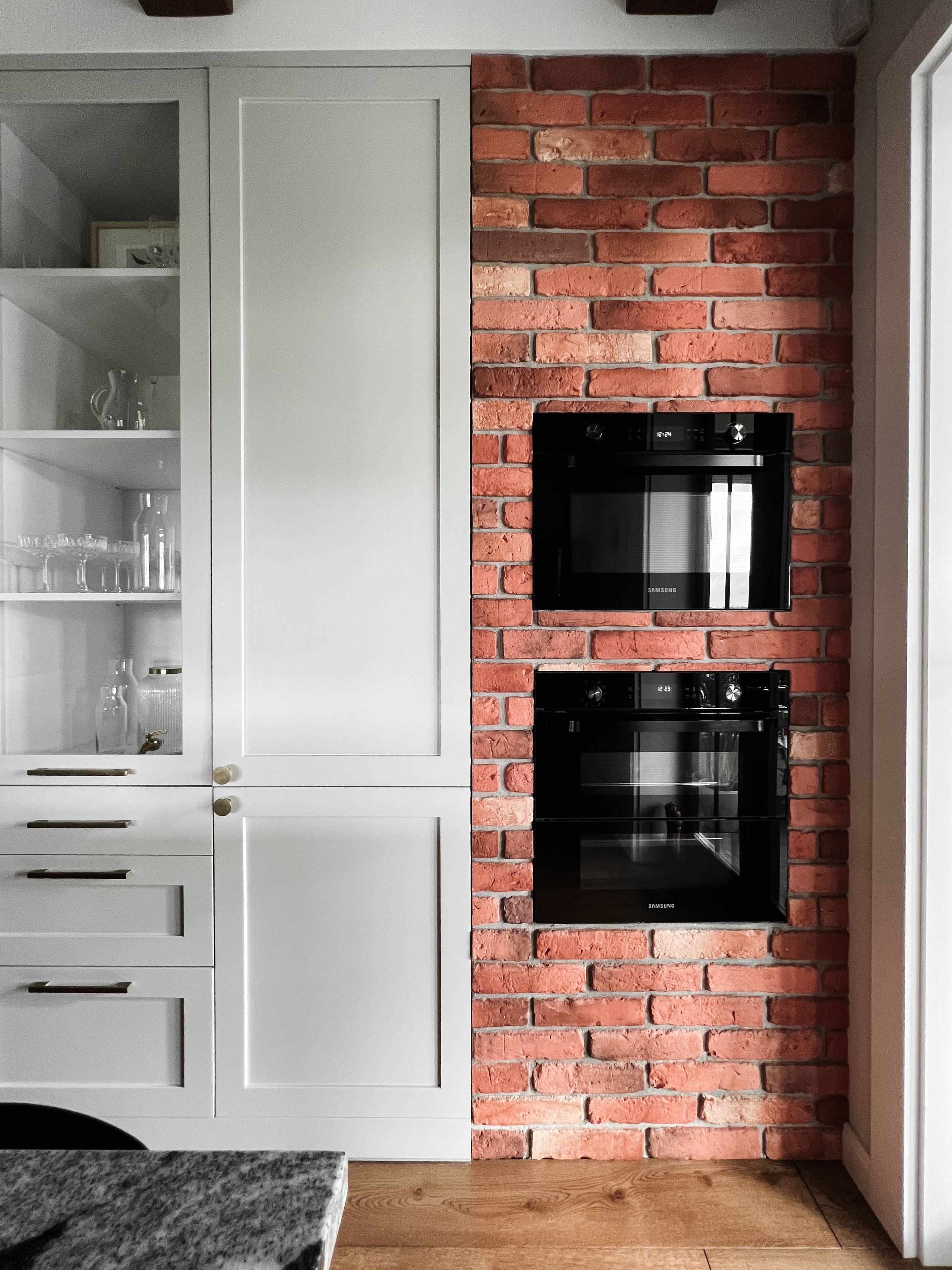 piekarnik i mikrofalówka wbudowane w ścianę z cegłami. To zupełnie nietypowe rozwiązanie, które zaproponowaliśmy klientom. Wygląda to bardzo spójnie z całą kuchnią, a jednocześnie dodaje jej farmhouse’owego stylu. Ciekawa jestem czy takie kiedyś już widzieliście?