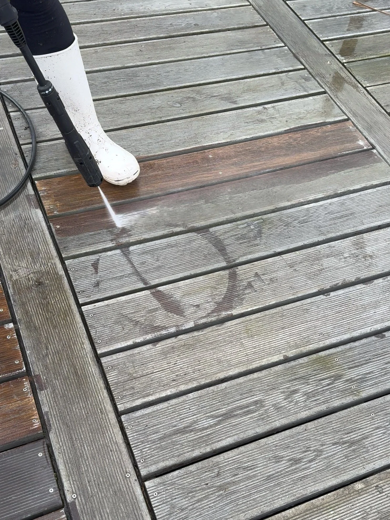 NIE ZALECA SIĘ mycia desek myjką ciśnieniową. Można zniszczyć w ten sposób wyheblowaną i wypolerowaną deskę, usuwając nadmiar miękkiej części desek. Podnoszą się wtedy do góry włoski drewna i powstają liczne mikrodrzazgi. Dlatego odradza się takie mycie. Tylko bardzo doświadczony fachowiec (ale i tak bym nie zaufała), który wyczuje miękkość Waszego drewna, może na własną odpowiedzialność podjąć się takiego zadania. Albo sami możecie to wykonać, ale jeśli stanie się to, co opisałam powyżej, taras będzie trzeba szlifować. Poniżej zobaczycie, że ja wykonałam usunięcie starego oleju właśnie w “ten niezalecany” sposób, ale uczulam na ryzyko, jakie podejmujecie. Ciśnienie w myjcie może być za duże i to zniszczy deskę. Dlatego aby usunąć stary olej, bezpieczniej jest to zrobić ręcznie, używając szczotki z twardym włosiem. Wtedy macie większą kontrolę nad naciskiem. Jeśli jesteście odważni, tak jak ja, Karcher oczywiście jest dużo szybszy i łatwiejszy.