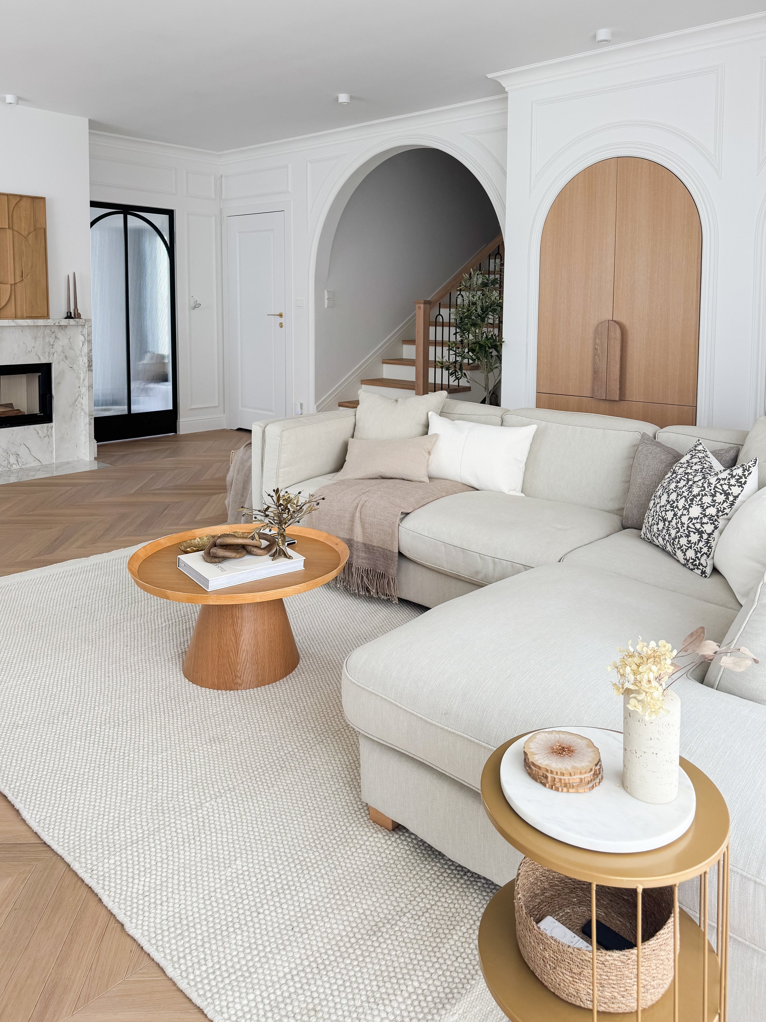 Centralnym punktem salonu jest eleganckie łukowe przejście prowadzące do schodów. Łuk ozdobiony jest listwą sztukateryjną giętą, a dokładnie Z13 flex ARSTYL® NMC (link >>>). Profile z serii FLEX NMC to elastyczne listwy z poliuretanu o wysokiej gęstości, które można dopasować nawet do nietypowych, zaokrąglonych powierzchni. Brzmi świetnie, prawda? Warto jednak zawsze zerknąć do karty technicznej – tam znajdziecie informację, w jakim kierunku i w jakim stopniu listwa może być wygięta (ma swoje granice elastyczności).
