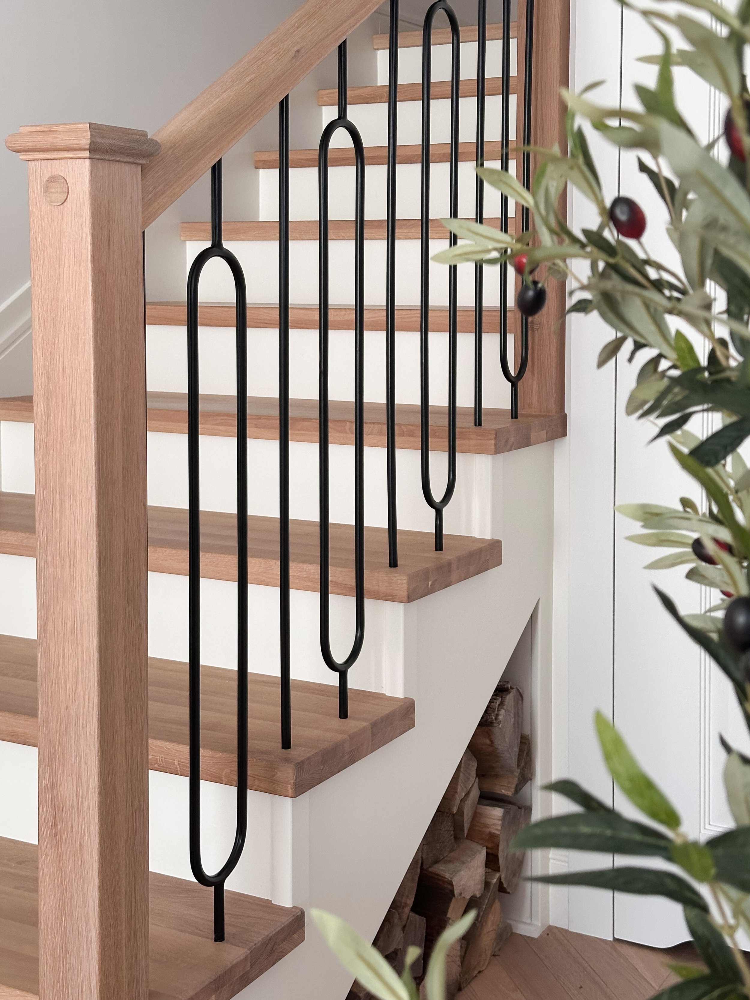 Biel ścian i sztukaterii kontrastuje z naturalnym odcieniem drewna, a detal w postaci zaokrąglonego pierwszego stopnia dodatkowo wzmacnia miękkość całej kompozycji.
