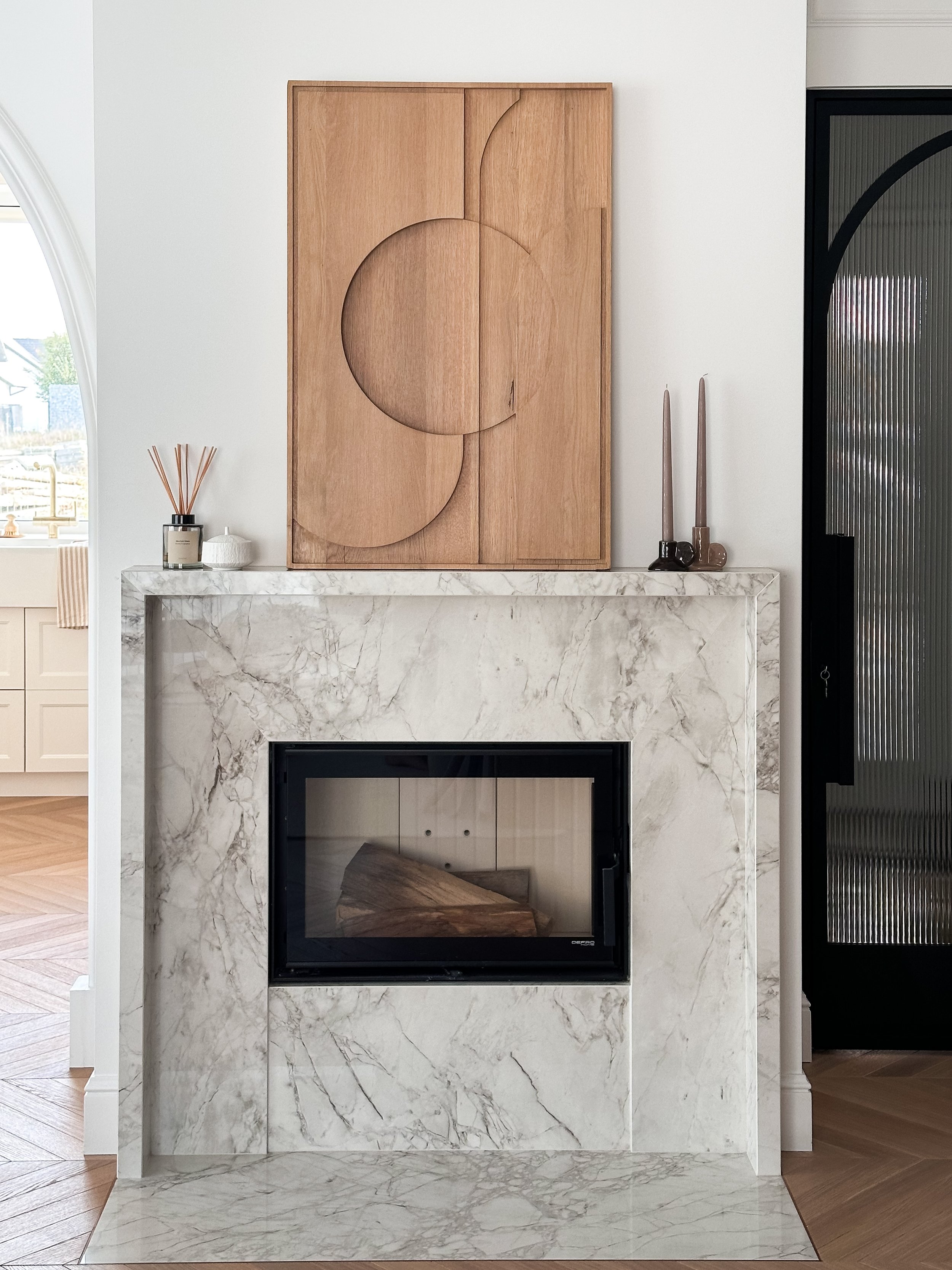Projektując taki portal kominkowy warto pamiętać, że kluczowe jest precyzyjne cięcie i spasowanie płyt, aby rysunek żył tworzył spójną, niemal malarską kompozycję. Zawsze polecam współpracę ze sprawdzonym zakładem kamieniarskim, który potrafi takie cuda, tutaj świetnie spisała się firma E-Stone (>>>link) , dzięki której portal wygląda zgodnie z naszymi oczekiwaniami.
