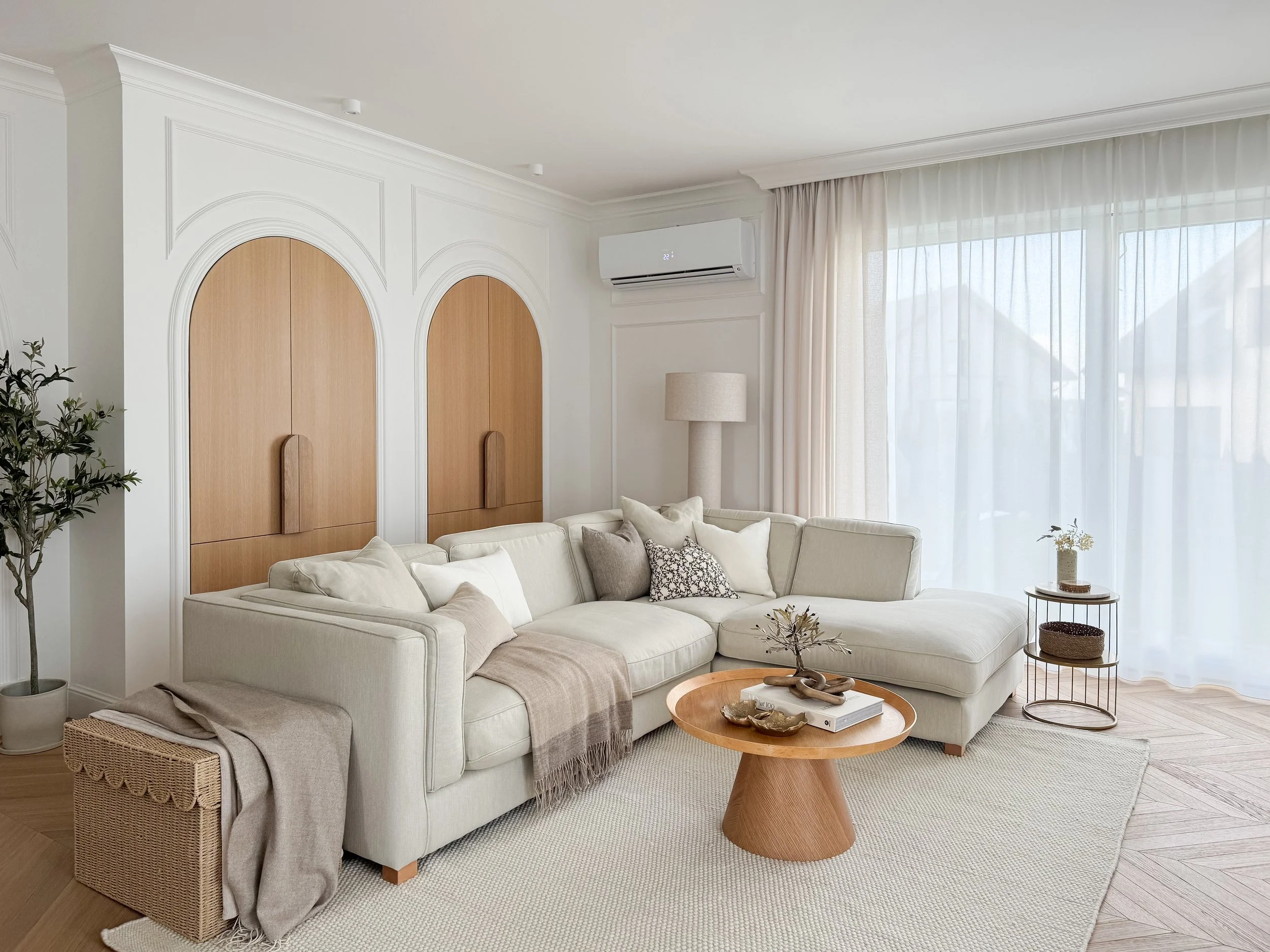 Strefa wypoczynkowa została zaaranżowana wykorzystując duży narożnik HARGETT, która mieści całą rodzinę podczas wspólnych seansów filmowych, jednak nie stoi on “pod ścianą”. Wysunięty nieco na środek, pozostawił miejsce na dużą zabudowę łukową wkomponowaną w ścianę.